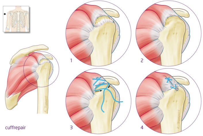 Een cuff repair is de term voor een hersteloperatie van de schouderpezen. De orthopedisch chirurg, ook wel orthopeed genoemd, kiest voor een open of scopische repair.